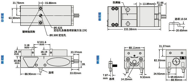 多功能钳型号:KTR35该多功能钳可以用在任何小台面的机床上,加上丝杠的外六角总 体长度只有257.175mm和9.07kg重量。钳口宽度88.138mm,张开 度96.774mm,使用钳口的台阶时张开度为105.664mm。带有防 屑板。可以通过钳身上的孔或者单独购买的压板固定虎钳。各个 侧面均磨削加工,方便各种方向使用。两个端面有四个适于压板 的空腔。当另外使用一台母钳时该钳可以作为正弦钳使用,依靠 钳身上的自身定位孔实现30°、45°和60°的角度加工(注:钳身上加 工这三个角度是客户选项,请联系我们报价)。当使用正弦钳功能 时,只需要把钳身侧面的磁力贴片揭下,并使用定位销即可。特点: